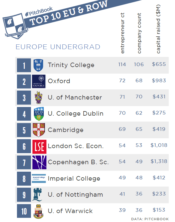Ngoài ra, do môi trường lý tưởng tại Ireland tạo điều kiện phát triển cho các dự án khởi nghiệp, FinTech và khuyến khích tinh thần kinh doanh, một số khóa học về kinh doanh tại các trường đại học Ireland đã cho thấy hiệu quả tốt. . hơn các khóa học tương tự ở các trường đại học khác nhau của Vương Quốc Anh và Châu Âu, với số lượng sinh viên trở thành doanh nhân cao nhất sau khi tốt nghiệp. Bảng trên cho thấy 10 trường đại học hàng đầu ở châu Âu theo xếp hạng số lượng sinh viên trở thành doanh nhân, cũng như số lượng công ty do những doanh nhân đó thành lập và tổng số vốn đầu tư mạo hiểm đã huy động được , theo PitchBook, một nền tảng cung cấp tài liệu chính.