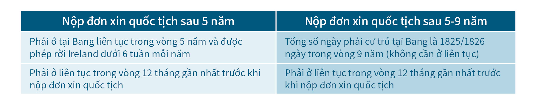 - Hoặc bạn chọn sống tại Ireland ít nhất 1825/1826 ngày trong 9 năm với điều kiện phải ở liên tục trong 12 tháng gần nhất trước khi nộp đơn xin quốc tịch.