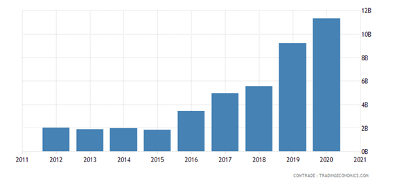 Bảng số liệu về giá trị hàng hóa xuất khẩu từ Ireland đến Trung Quốc tính theo USD